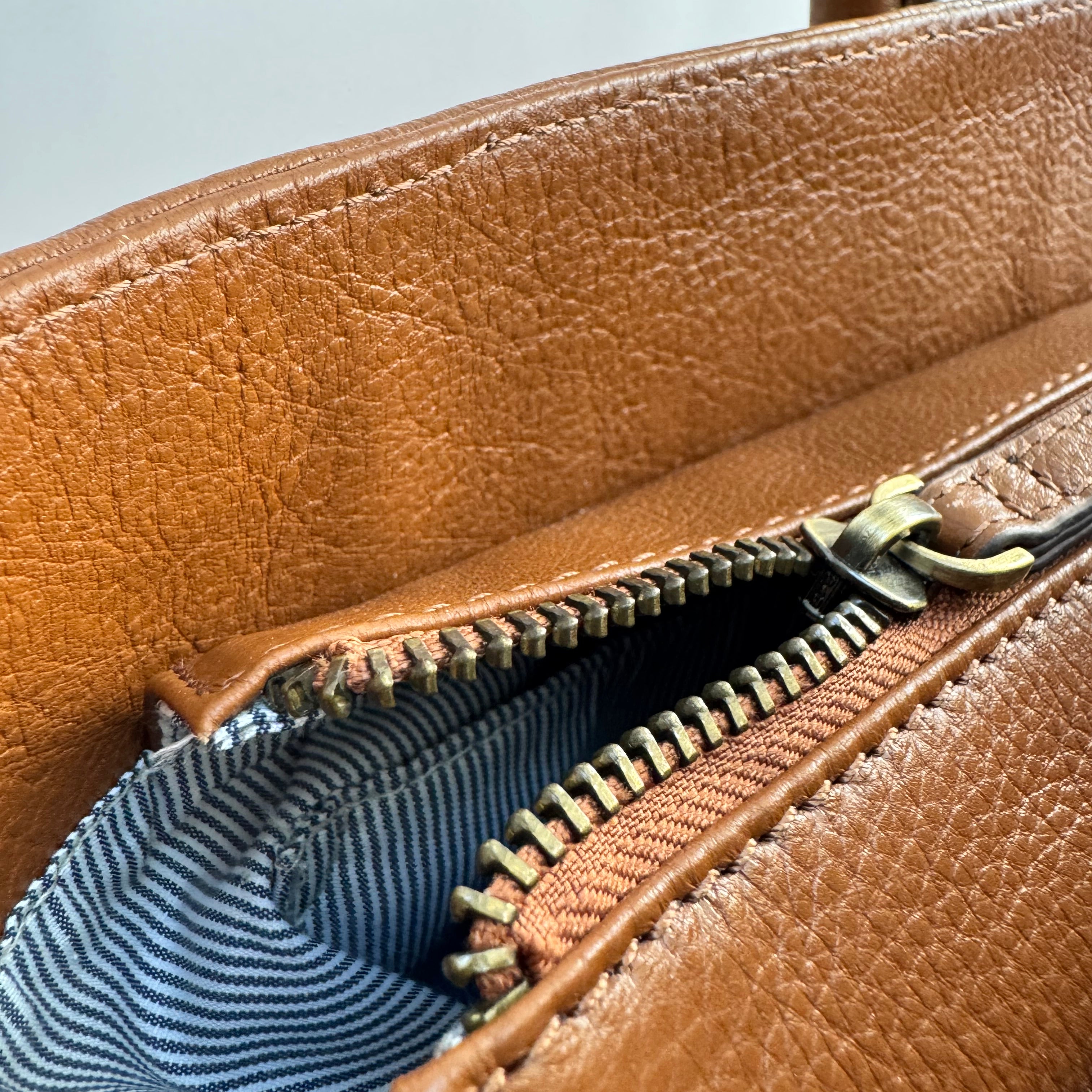 - Brass zipped topline closure